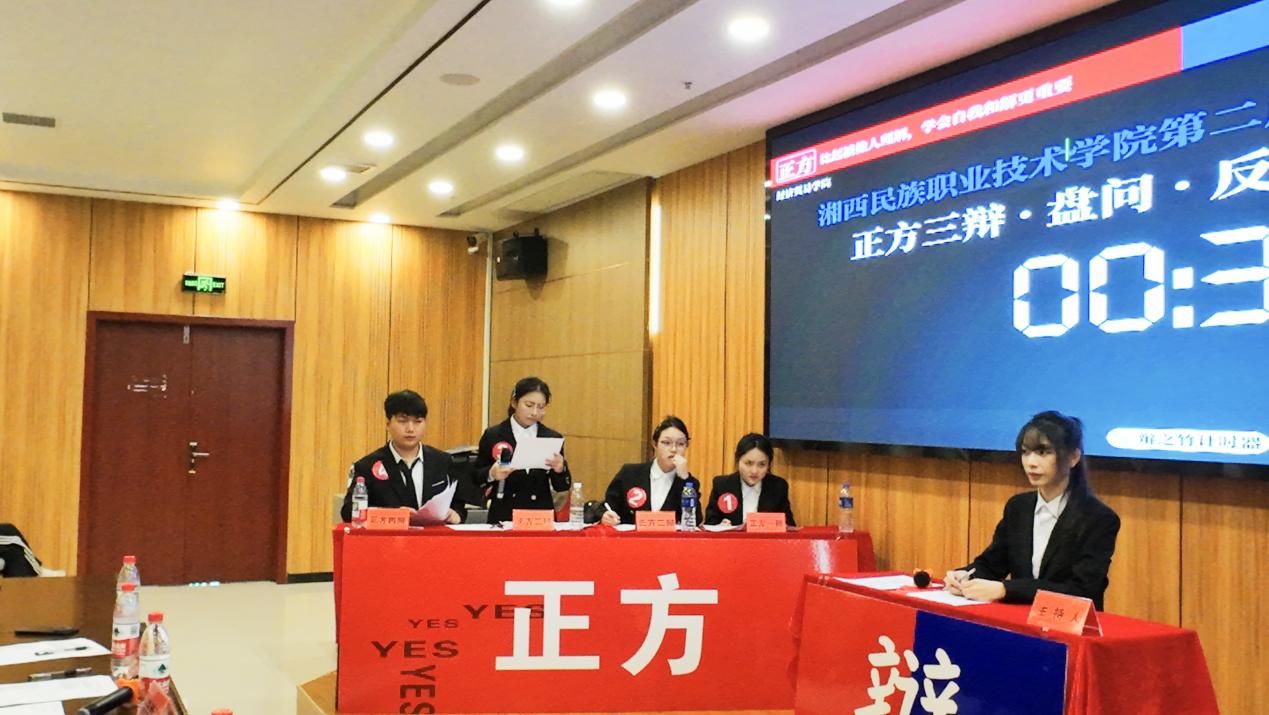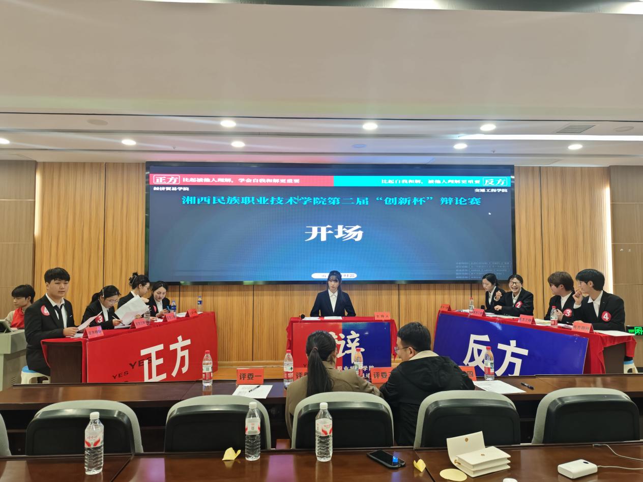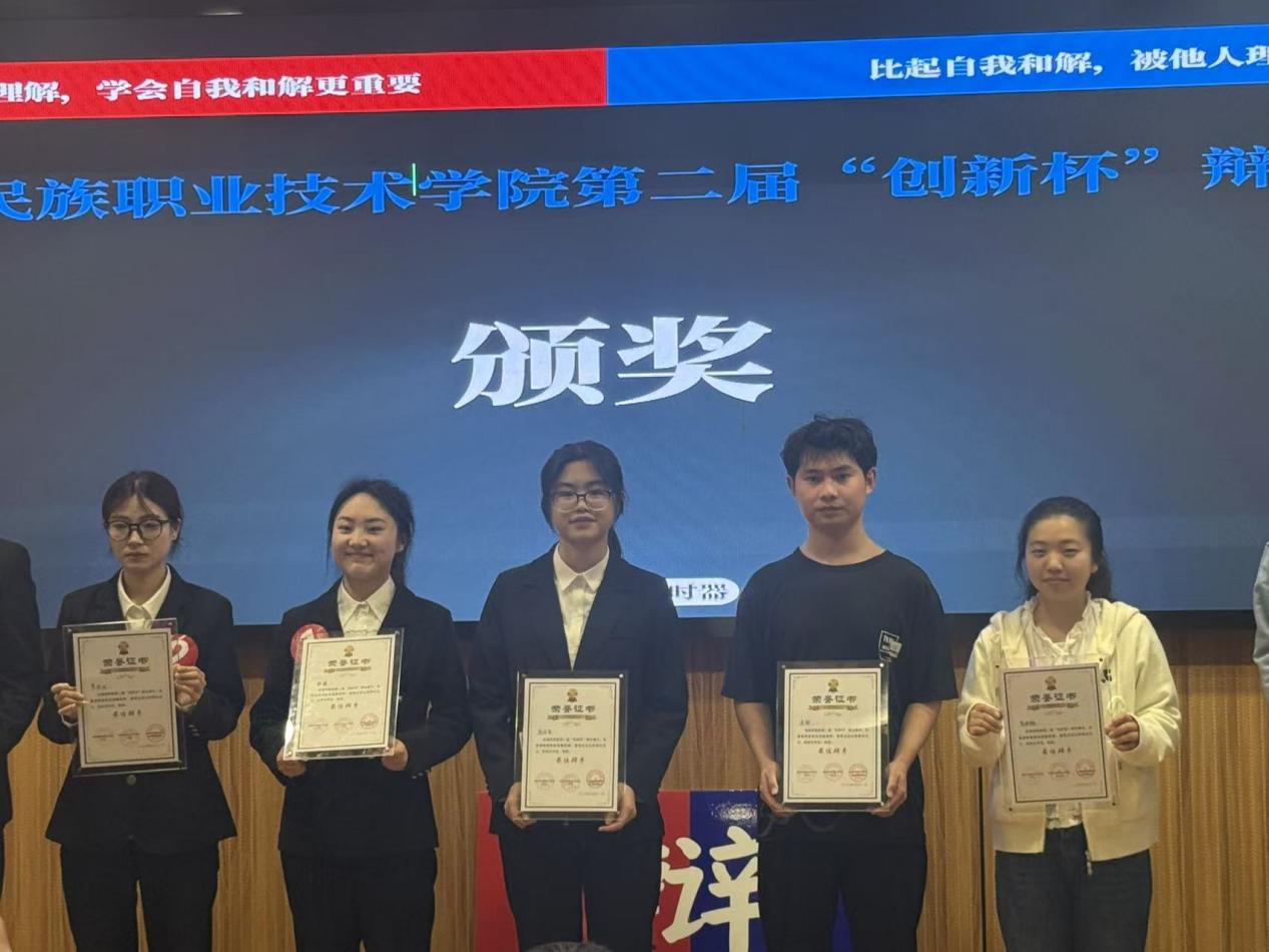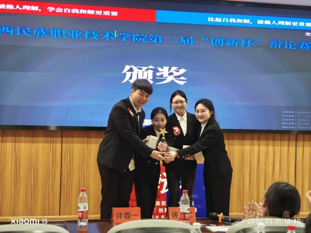 2026年3月31日下午16:30,湘西民族职业技术学院第二届“创新杯”校级辩论赛决赛圆满落幕。经过多轮激烈角逐,经济贸易学院辩论队(一辩舒健、二辩文茜茜、三辩杨文锦、四辩张金鹏)凭借扎实的知识储备、严密的逻辑思辨和默契的团队配合,一路过关斩将、力克群雄,最终斩获本次辩论赛冠军,其中一辩舒健凭借出色的临场表现,获评“最佳辩手”,为学院赢得了荣誉。