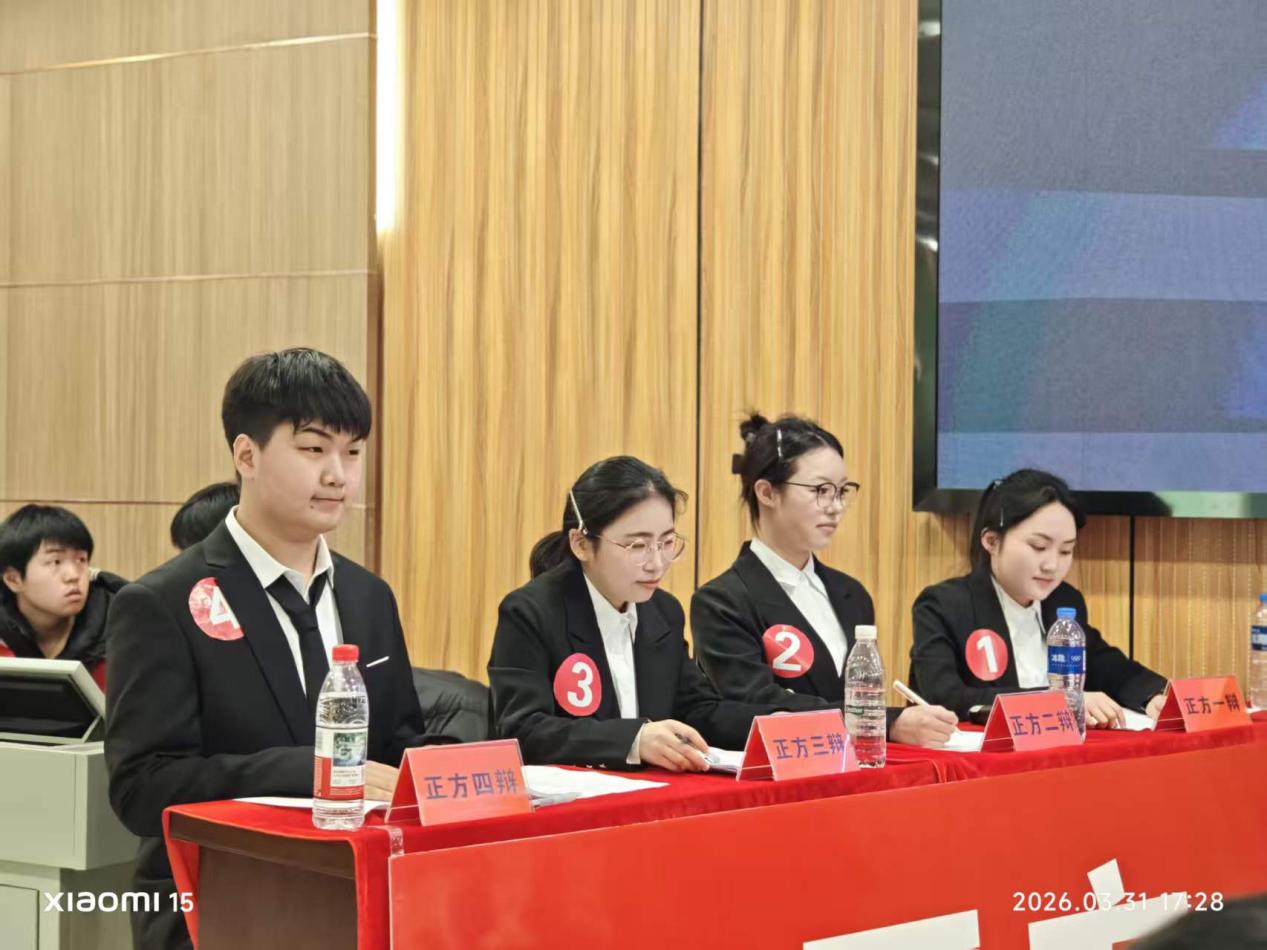 本次第二届“创新杯”校级辩论赛以“思辨明真理,奋进启新程”为主题,吸引了全校各二级学院多支队伍同台竞技,赛事兼具思想性与实践性。决赛阶段,辩题围绕“自我和解比他人理解更重要”展开激烈交锋,既考验辩手的理论素养,也锤炼其临场应变能力。经济贸易学院高度重视此次赛事,赛前精心选拔舒健、文茜茜、杨文锦、张金鹏四位优秀学子组成辩论队,并邀请郭淑媛、贺辰衎两位老师担任指导老师,全程为辩手们提供专业指导,为团队夺冠奠定了坚实基础。