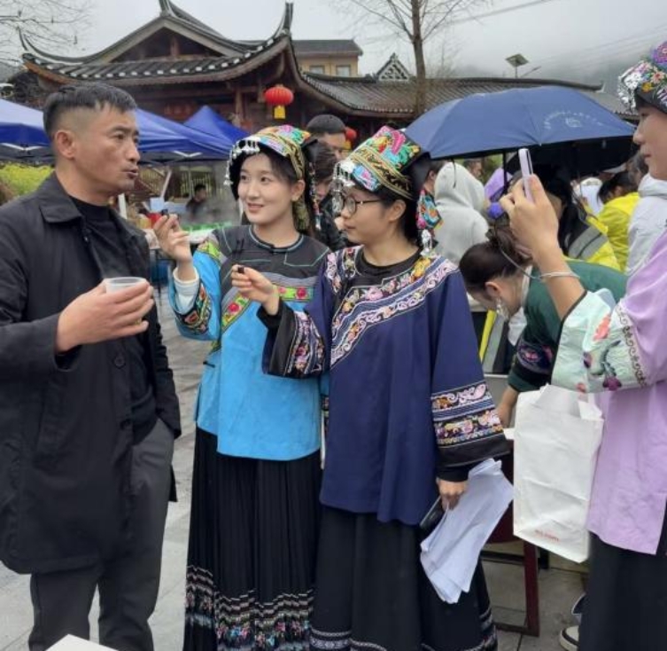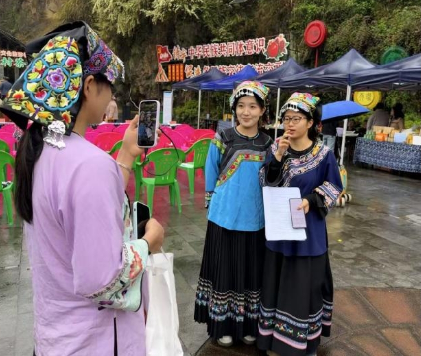 活动现场,数十口铁锅一字排开、炉火正旺,浓郁茶香弥漫整个苗寨,与迎宾鼓舞、茶歌相映成趣。经贸学院学子化身“乡村传播使者”,依托校企合作搭建的直播设备,以“苗寨茶香·非遗之约”为主题开启全程直播。他们穿梭在各个活动环节,热情洋溢地向网友介绍活动盛况,精准捕捉每一个精彩瞬间,实时讲解保靖黄金茶“四高四绝”的品质特点、传统制茶技艺的精髓,以及三代同锅炒茶的匠心故事,与网友热情互动,解答关于黄金茶种植、制作、品鉴的相关问题。镜头切换间,88岁老茶人的炒茶风采、非遗传承人的技艺展示、全球合伙人授牌的高光时刻,都被清晰传递给屏幕前的观众。这一实践将课堂所学的数字营销、新媒体传播等技能直接服务于茶产业推广,以产教融合之力助推保靖黄金茶品牌“出圈”,切实展现了校企协同赋能乡村振兴的实效。